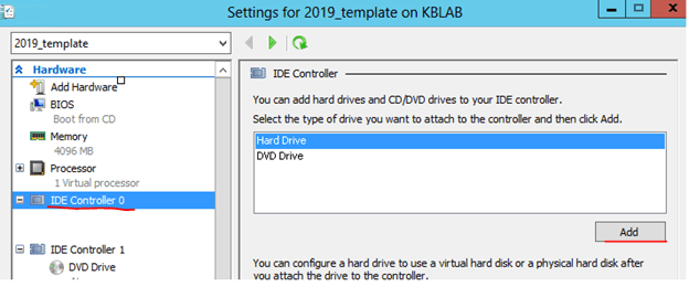 - Go back to the settings of this new VM and go to IDE Controller 0 to add a new Hard drive. Browse to the location of the vhdx that you just copied in step 9.