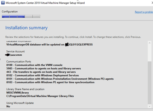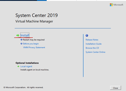 We are installing the VMM server and the console, select Install. We will need to use the same installer to install Local Agent on a few other servers in order for them to communicate properly.