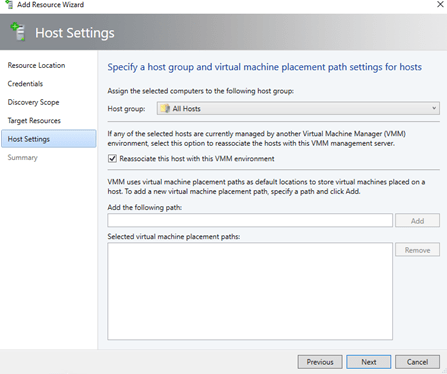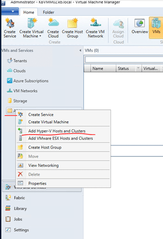 In the VMM console, go to VM and Services, right click on “All Hosts” and select “Add Hyper-V Hosts and Clusters.