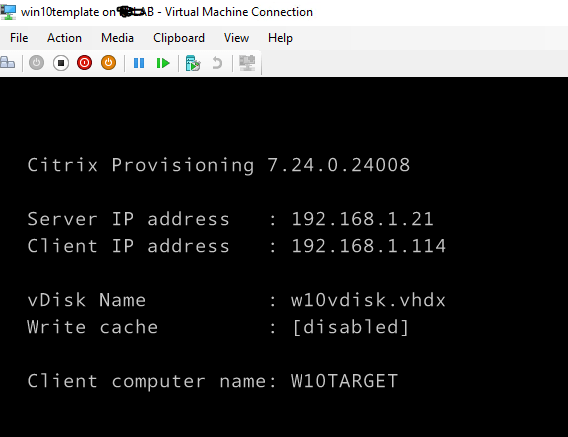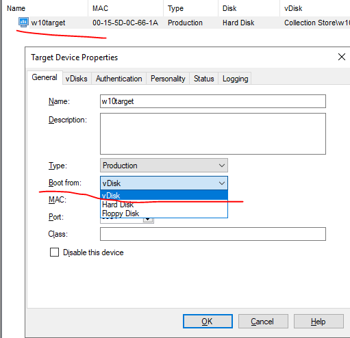 Right click on w10target and select properties. If we want to make it a disk-less VM, we will need to change it to boot from vDisk. Now, remove the C drive of w10target from your hypervisor and start it up again.