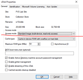 After we installed the VDA client, reboot the VM a few times to make sure all the installations are completed. Some time it takes it a few reboots to finish up all the configuration. Shut down the VM then go to the properties of the vDisk from PVS01. Note that you may need to right click and remove Locks if you just shutdown the VM and it did not refresh the status yet.
