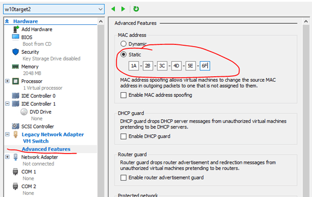 First, create an empty VM from Hyper V manager. We will call it w10target2 and make it Gen 1 with a Legacy Network Adapter. Do not add a hard disk to this VM. We will need to assign the Legacy NIC a unique MAC address. The MAC address is a requirement to assign the vDisk to any New VMs. Go to Advanced Features and give it a static MAC address. (In a production environment, you would want to keep track of all the assign MAC addresses so we won’t have any duplicates.)