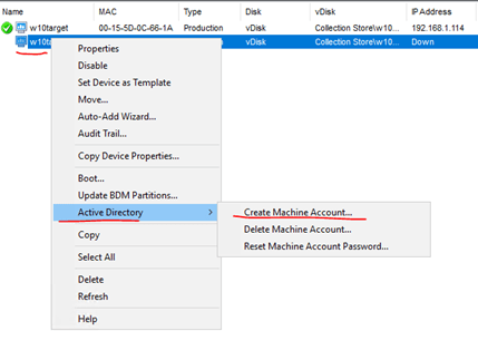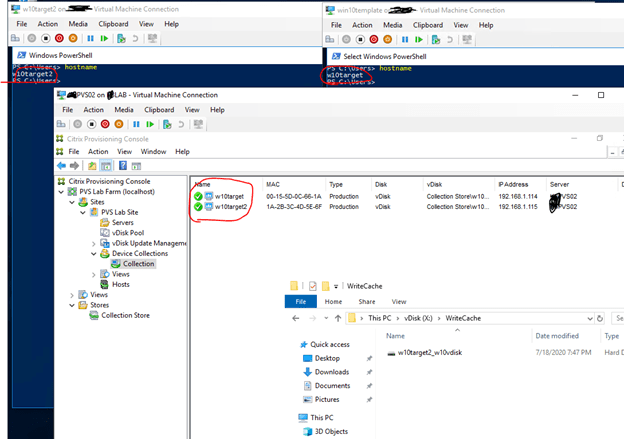 Do not forget to create a new Machine Account for this new VM. Now that we have associate the vDisk with the MAC Address, we can go ahead and turn the VM on. If you created a small boot disk for this new VM, it would still boot using the write cache the first time. Only after you have initiated the boot disk, it will then use the bot disk for caching. Because our vDisk is in Standard mode, we can keep our w10target VM running while turning on w10target2. Both VMs will be running without a hard disk attached, sharing the same vDisk.