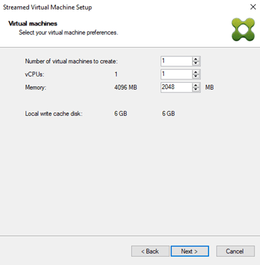 Choose the resources to allocate to this VM. You can create more than one VM with this wizard. Note that this will automatically created a 6 GB disk for local write Cache disk for you because this disk appears in the template.
