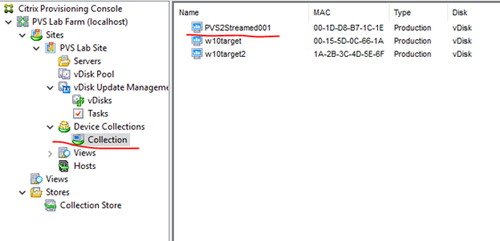 You will also find it in the Collection in PVS console. Because we used the Streamed VM wizard to deploy this VM, its MAC address is automatically linked to that vDisk.