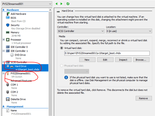 It has the Legacy Network Adapter and the 6 GB disk created. The first time the VM boot, it is still going to use the Write Cache folder on PVS01 to write cache.