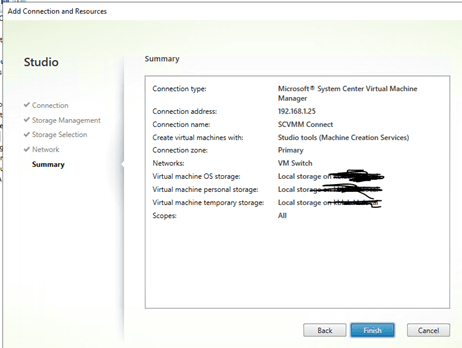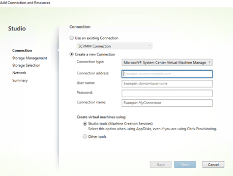 Select SCVMM as your connection Type (That is if you are using SCVMM), your VMM01 as Connection Address, and an account that can connect and access VMM01. Give it a name to identify this connection. I called mine “SCVMM connection”. We will be creating VM using Studio tools. For this to work, you will need to install VMM console on your PVS01 and your DDC01 to communicate with SCVMM.