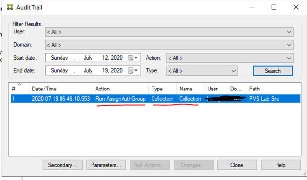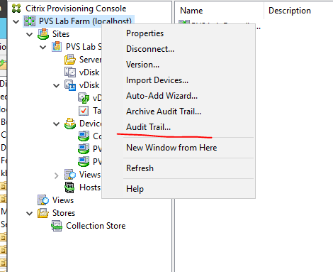 With auditing enabled, right click on the farm, and select Audit Trail. If there is any activity after we enabled auditing, it will now show in the Audit Trail.