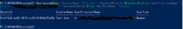New-AzureADUser -DisplayName “Test User” -PasswordProfile $PasswordProfile -UserPRincipalName testuser@yourdomain.com -AccountEnabled $True -MailNickName 'TestUser"