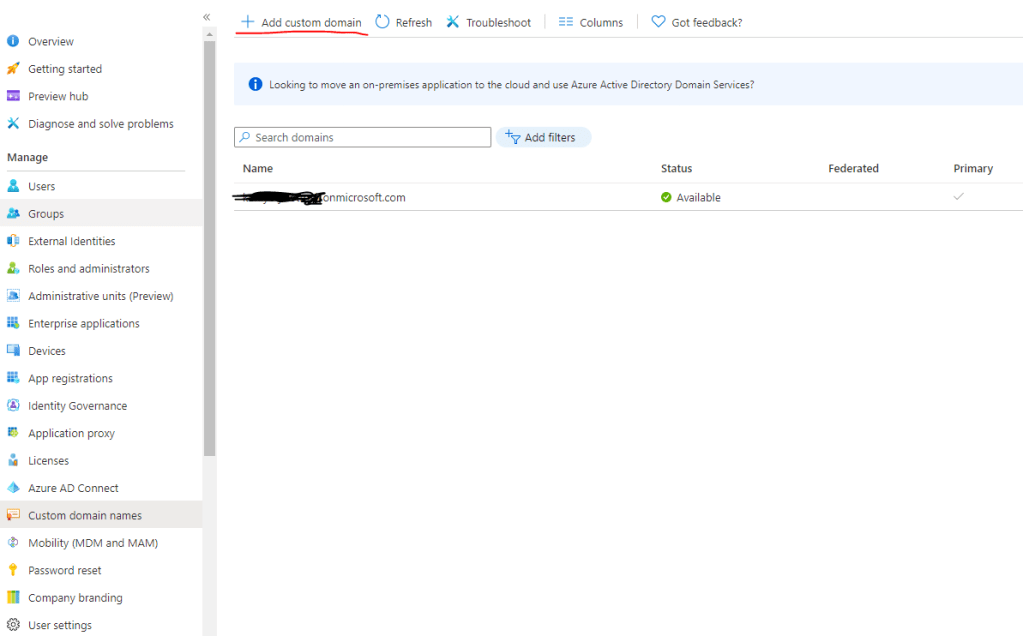 You will also need to add the domain UPN suffix in your on premise AD. If you have a custom domain name, you will use that. Don’t forget to add that to your Azure AD as well. To do so, go to Azure AD portal -> custom domain names.