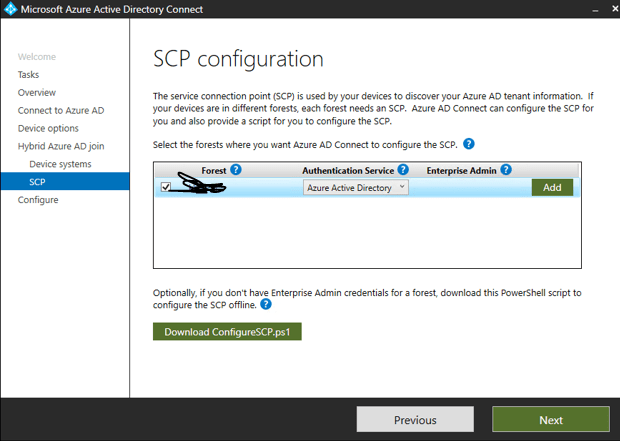Check the checkbox for your on Premise forest, and select the Authentication service and “Add”the SCP configuration.