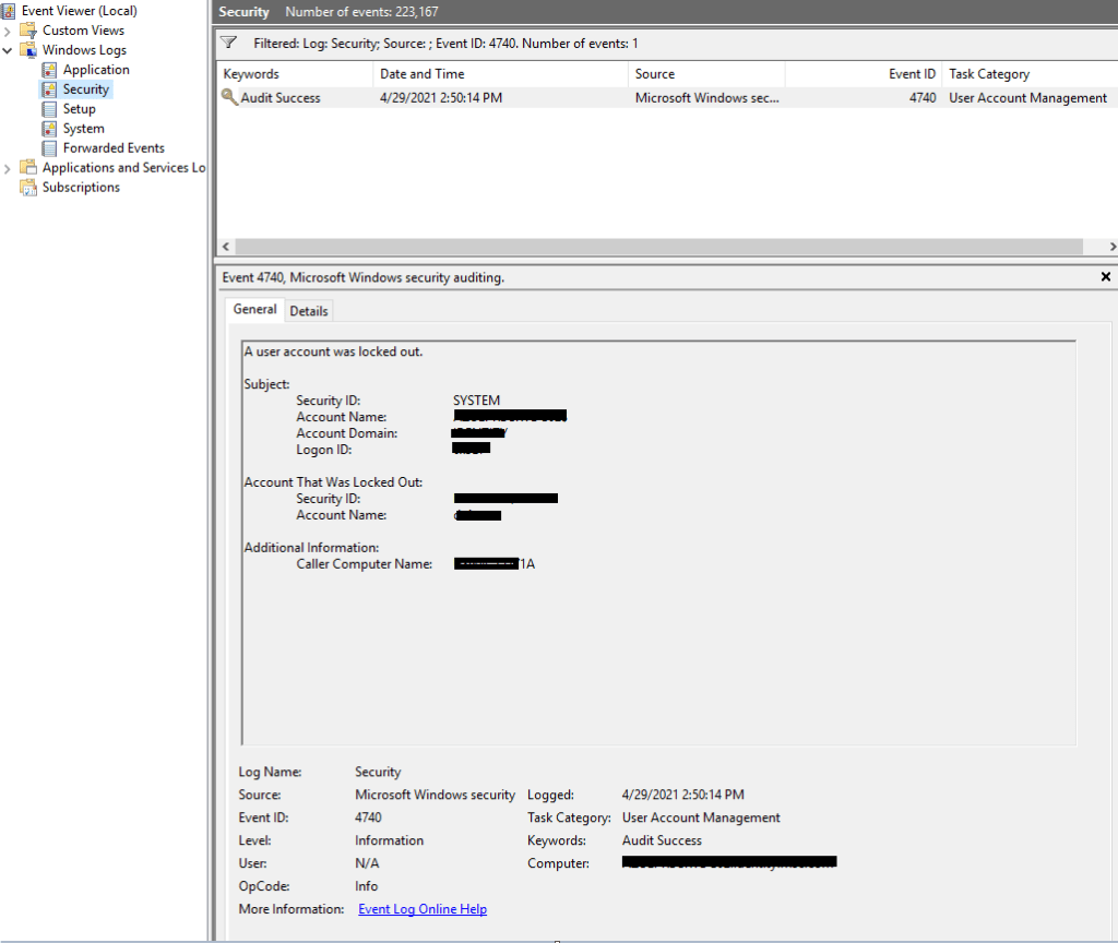 If there are multiple event ID 4740 entries for different users, locate the one that contains the Security ID and Account Name matching the user’s details. Pay attention to the Caller Computer Name field, which represents the computer where the user attempted to log in and caused the account lockout.