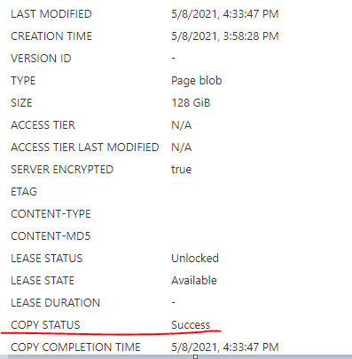 This script will trigger copying the snapshot from the Source to the Destination blob storage by getting an access key that expires in 3600 seconds. Once the copying job is triggered, you will see the NewVM_snapshot.vhd in the Destination storage. It will have a Copy Status of “Pending”. It will change to “Success” after awhile.